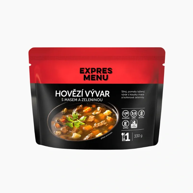 hovězí vývar (voda, hovězí maso a kosti, cibule, česnek, bobkový list, nové koření, pepř, sůl), směs zeleniny (mrkev, celer, petržel) (23 %), hovězí maso (15 %), sůl kamenná, pepř.