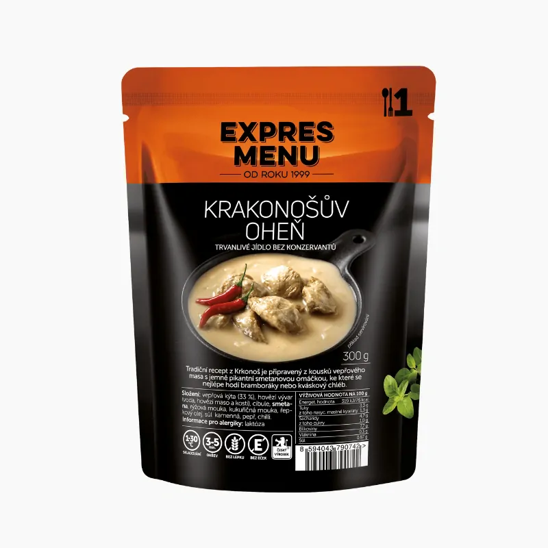 Vepřové maso (33 %), cibule, smetana, rýžová mouka, kukuřičná mouka, řepkový olej, sůl (jedlá kamenná sůl, jodičnan draselný), pepř, chilli.
