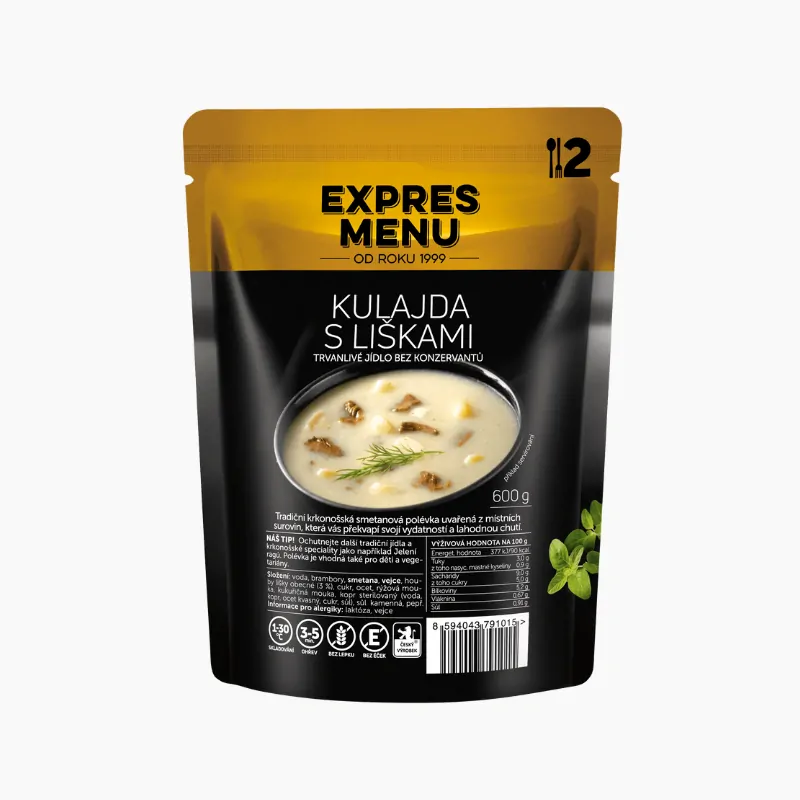 voda, brambory, smetana, vejce, houby lišky obecné (3 %), cukr, ocet, rýžová mouka, kukuřičná mouka, kopr sterilovaný (voda, kopr, ocet kvasný, cukr, sůl), sůl kamenná, pepř.