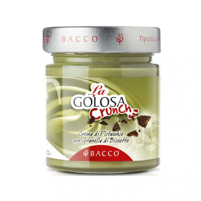 Pistáciový krém La Golosa crunch. jedinečná chuť pistácií s křupinkami čokolády, které se rozpustí v ústech. Lahodný krém, který můžete natřít na toust, croisant, palačinky nebo jím ozdobit dort.