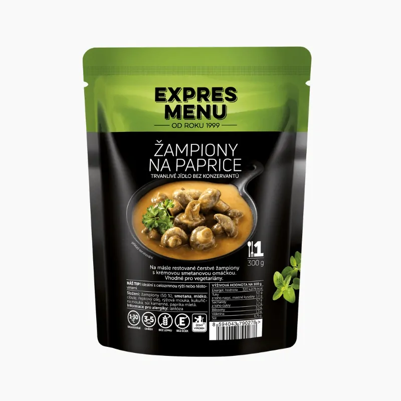 Žampiony (50 %), smetana, mléko, cibule, řepkový olej, rýžová mouka, kukuřičná mouka, sůl (jedlá kamenná sůl, jodičnan draselný), paprika mletá.