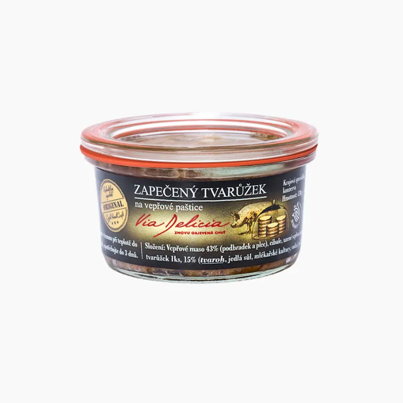 Objevte originální kombinaci lahůdkové vepřové paštiky a Olomouckých tvarůžků, kde je dobře uzrálý tvarůžek umístěn přímo na paštice a zapékán ve skleničce. Každá sklenička obsahuje celý tvarůžek, který dodává tomuto výrobku nezaměnitelnou a typickou chuť. Vepřová paštika, která je nasládlá a skvěle chutná, je ideální na smažených topinkách, s kyselým okurkem nebo se zeleninovou přílohou.